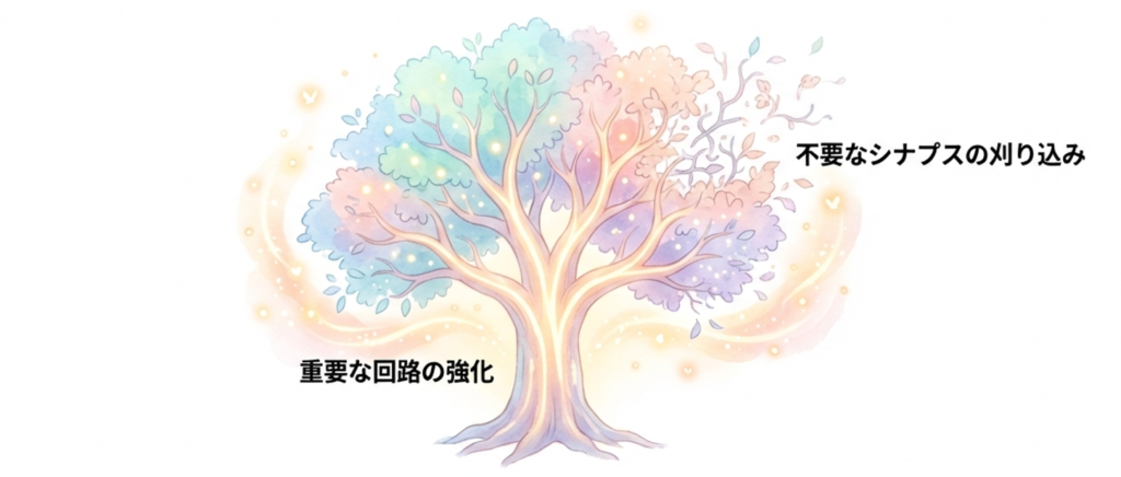 子どもの脳から大人の脳へと移行する思春期には、「シナプス刈り込み(Synaptic Pruning)」という大規模な脳回路の再構築が行われます。
