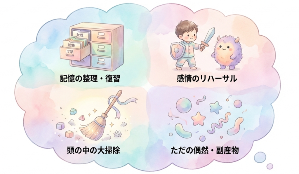 では、夢そのものの役割についてはどんな説があるのでしょうか。現在、有力視されているものをいくつか紹介します。